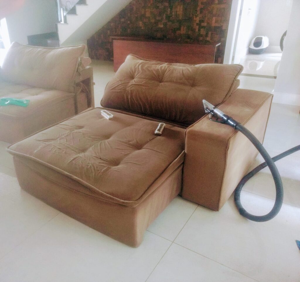 Vamos esfregar todas as partes do seu sofá, usando um produto a base de água. Logo após vamos usar a extratora, para jogar água limpa e tirar a sujeira